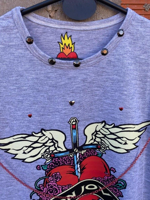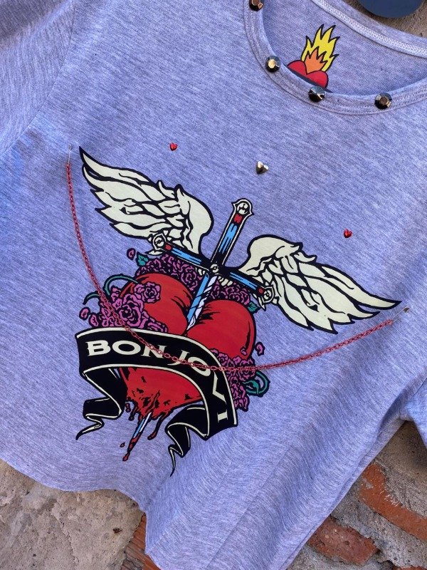 Detalle de tachas corazón y cadena roja metalizada en delantero (se puede retirar)