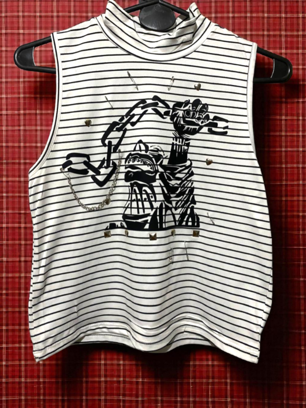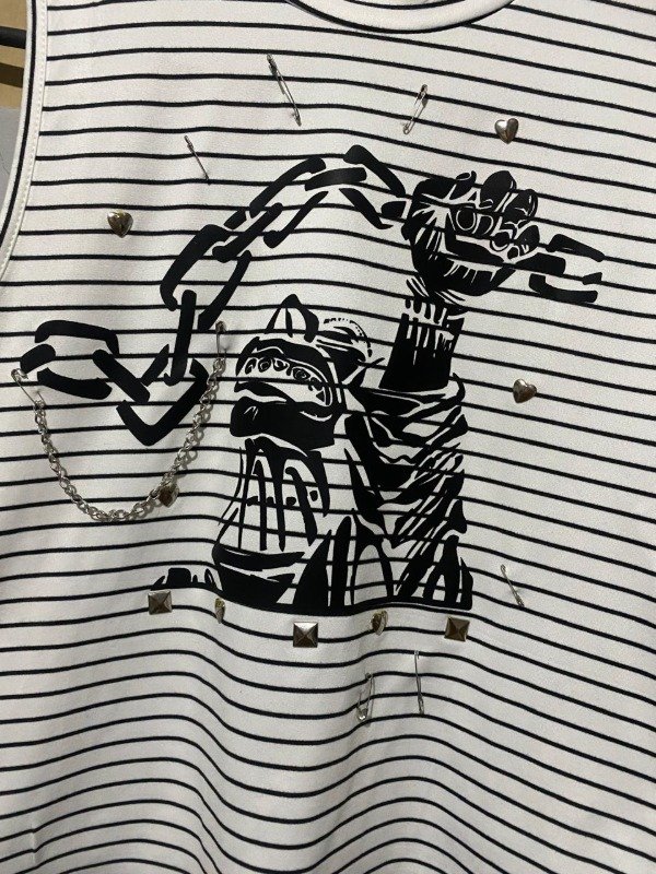 Detalle de tachas corazón, cuadradas y alfileres de gancho alrededor de estampa.